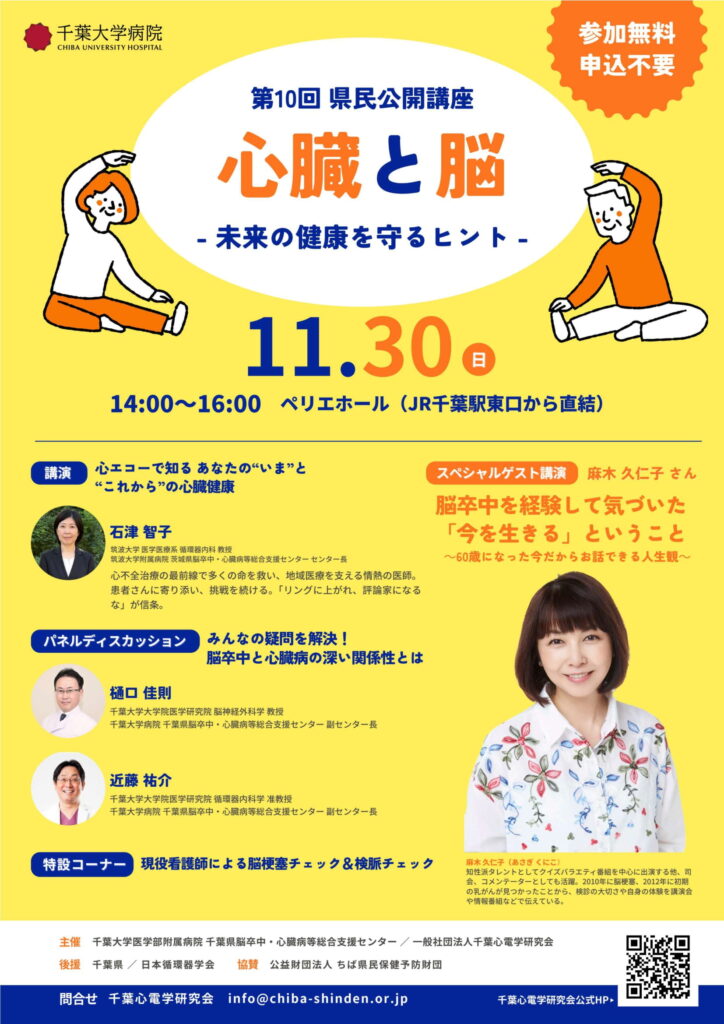 千葉心電学研究会(Erekaru/エレカル)では、脳卒中・心臓病等総合支援センターとともに、来たる11月30日(日)に第10回県民公開講座を開催いたします。